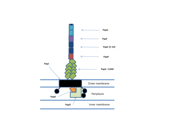 Chaperone/usher fimbriae have many roles, in many stages of pathogenicity in several species. The most well understood are roles in adhesion, innate immune evasion and localisation. Adhesion is facilitated by the lectin domain at the tip of chaperone/usher fimbriae, this domain of FimH is well understood. FimH is the first subunit of the type I pilus in species such as UPEC and binds to D-mannosylated residues in the bladder, allowing pathogen adhesion and colonisation. Immune evasion is also facilitated by the tip adhesin, for example the binding of Decay accelerating factor (DAF) by gamma3 clade fimbriae inhibit effective complement activation. Localisation could be performed by sequential expression of different chaperone/usher systems. Most species of pathogenic bacteria express more than one type of chaperone/usher system, for example in Pseudomonas aeruginosa there are five different systems. UPEC expresses both the type 1 fimbriae and the P-pilus (pap) which it expresses sequentially possibly to facilitate migration from the bladder (type I fimbriae) to the kidney (pap). This importance in pathogenicity makes the chaperone/usher system an attractive target for novel drug therapies. By targeting pathogenicity instead of the organism (in the case of conventional antibiotics) the strong selective pressure for evolution of resistance is removed. In the case of UPEC there have been some success in pilicidal (stopping pilus formation) clinical trials and the development of an effective vaccine in mice and cynomolgus monkeys based on FimCH complex.[8]