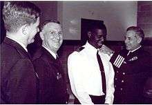 Frocking ceremony for U.S. Navy's first Muslim chaplain, when Navy (rabbi) Chaplain Arnold Resnicoff attaches new shoulder boards with Muslim Chaplain crescent insignia to uniform of Imam Monje Malak Abd al-Muta Noel Jr, 1996.