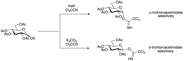 Trichloroacetimidates were first introduced and explored by Schmidt in 1980[20][21] and since then have become very popular for glycoside synthesis. The use of trichloroacetimidates provides many advantages including ease of formation, reactivity and stereochemical outcome.[11] O-Glycosyl trichloroacetimidates are prepared via the addition of trichloroacetonitrile (Cl3CCN) under basic conditions to a free anomeric hydroxyl group.