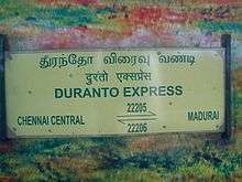 - ↑ "Chennai-Madurai Duronto Express likely from Nov.". The Hindu. 14 July 2011. Retrieved 9 December 2013.