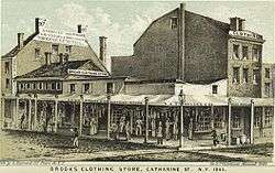 In 1818, Henry Sands Brooks opened H. & D. H. Brooks & Co. on the northeast corner of Catherine and Cherry Streets in Manhattan "to make and deal only in merchandise of the finest body, to sell it at a fair profit, and to deal with people who seek and appreciate such merchandise."[3] In 1850, his three sons, Elisha, Daniel, and John, inherited the family business and renamed the company "Brooks Brothers," which is the oldest men's clothier chain in the United States.