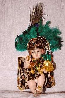 The Niño Dios (literally Child God) of Mexico is a tradition of venerating the Child Jesus in Mexico which has taken root from the time it was introduced in the 16th century and then syncretized with pre-Hispanic elements to form some unique traditions.[1][2] Mexican Catholics have their own images of the Child Jesus, which is honored and celebrated during the Christmas season, especially on Christmas Eve and on Candlemas (2 February). One tradition unique to Mexico is to dress the image in new clothing each year for presentation at Mass on Candlemas. This dress can vary from representations of the saints, Aztec dress, football/soccer players and more. Also, there are Niño Dios images which are locally famous and honored year-round.[3]