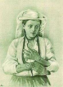 The custom is thought to predate the Slavic migration to the Balkans and even Christianity. In the 1st century BC, the Greek historian Strabo mentioned tattooing among inhabitants of this area,[2] along with another Illyrian custom.[3] Archaeologist Ćiro Truhelka researched these types of tattoos in the late 19th century, becoming one of the first to write about them and to illustrate them.[4][5]
