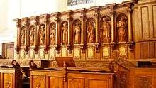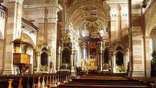 Saint Maurice served as the abbey church of a now defunct Benedictine monastery, originally founded in the 7th century and belonging to the oldest in Alsace.[3] The relatively plain exterior of the building, construction of which was started in the late 17th century to replace a much older predecessor, is related in its rectangular floor plan to a medieval form of architectural language and indicates nothing of the richness of the interior design and furnishing. These are largely the work of Tyrolean artists: the ceiling paintings (1730–1733), with depictions of the legends of Maurice and of Benedict are by Josef Mattes (nave) and Joseph Mages (chorus, transept, crossing); the choir and confessionals were also made by Tyrolians. Some Alsatians and Germans were however involved in the design of the bright and colorful interior: The expressive Samson pulpit (see also St. George's Church, Sélestat) is a work by Clemens Winterhalder and the mighty main altar (1728) one by Jean-Léonard Meyer from Sélestat The other altars are works by Anton von Wihl, from Sélestat, and Anton Ketterer, from Colmar.