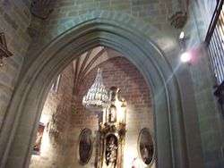 When the new main front was built the Ibiceta family which had their family sepulchre in the chapel decided to transform it to an artistic mausoleum with prayerful sculptures and diverse decorative elements. The chapel contains a round-headed arch sustained by Corinthians columns.