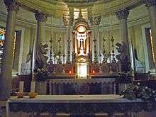 The high altar in the apse is formed by a marble mensa with a tabernacle and flanked on each side by a statue of a kneeling angel. The half-dome above the altar was decorated by Giovanni Bevilacqua (early 1900s) and the fresco represents Christ triumphing over Paganism with the inscription "Vicit Leo de Tribu Iuda" (Book of Revelation 5:5)