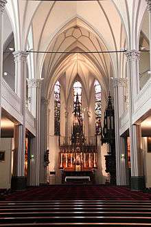 De Papegaai is the lesser of the two parochial churches in the St Nicholas Roman Catholic parish in Amsterdam. The church is dedicated to Saints Peter and Paul. It is nicknamed "De Papegaai" (The Parrot) because it was originally hidden in a garden behind a regular housefront that belonged to a bird-trader in the days when Catholicism could not be practised publicly. Today there is a narrow, Neo-Gothic facade flanked by statues of St Joseph and a perched parrot. The church is on the busy Kalverstraat, just south of Dam Square, and invites people in for quiet, as well as celebrating Sunday masses in Latin and with Gregorian chant.