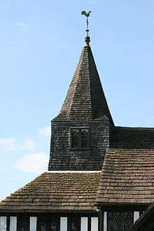 The timber frame features close studding with a middle rail.[1] It rests on a stone plinth, the infill is rendered brick and the roof is of slate. At the west end is a shingled square tower with a shingled broach spire ending in a weather cock. This is surrounded by lean-to roofed aisles on the north, west and south sides. The tower has a western arched door with a 20th-century door which incorporates 17th-century iron strap hinges.[1] The body of the church consists of a three-bay nave with north and south aisles, a two-bay chancel and north and south chapels at the ends of the aisles, and a south porch.[8]