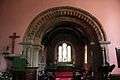 The dog's tooth Norman chancel arch is still untouched and the piscina in the south wall, and two doorways on the opposite wall also appear to be original. The font on the south wall is decorated with crude images of faces, birds and a serpent in a Garden of Eden theme. At first sight it appears to be an unusually well preserved example of a 12th-century font, and carries a label that uses the word "early", but is now thought by historians to be a 19th-century pastiche. A second plain font may date from the 15th century.[2] Further work by the Welsh architect John Prichard[10] was completed in 1875. The west turret was replaced by a bell arch. The east window dates from 1957, and the church was last restored in 1989-91.[6][10] On the east side beside the road there is a garden of rest with a calvary cross. The church sits on land between the road and the river Monnow and a contemporary ceramic mosaic has been installed by Monmouth Town Council. The circular plinth is made of 40 tiles that illustrate and commemorate the Millennium showing over 2,000 years of local history.[5]