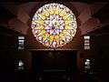 - View of the 16-paneled stained glass window, created by Joël Mône and realized by Vitrail Saint-Georges, from the third level of church building.