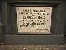 On the night of 8 September 1915, Zeppelin L13 commanded by Kapitänleutnant Heinrich Mathy attacked London, and two of his bombs hit Messrs Frank Stadelman's warehouse at 59–61 Farringdon Road. Falling masonry from the building did considerable damage to the 6th Londons' drill hall behind.[71][72]