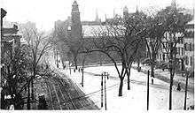 Development in the area began to increase when the Erie Canal, which connected to the Hudson at the Albany Basin, was completed in 1825. On December 29, 1828 notable residents Israel Smith and Samuel Pruyn, among others, petitioned the Common Council to improve the junction of Clinton and North Pearl streets,[8] an area increasingly visible to visitors to the city. It wasn't until a month later, on January 26, 1829, that the Common Council's committee on the subject reported in favor of the improvement and recommended that the square be named Clinton Square.[9] It was on August 17, 1829 that the Common Council declared North Pearl Street between Orange Street and Clinton Avenue to be widened and renamed Clinton Square, and the park to be roughly 200 by 60 feet.[10] A small park, it was considered one of the city's major achievements of the time. It was considered the first city improvement north of downtown, the city being focused on the southern section prior to this.[8] The creation of Clinton Square marks the beginning of the district's development and history.[1] By March 1831, however, the opening of the square was denounced as "a monument of the stupidity of its originators" and "had a tendency to reduce rents in that quarter".[11] By 1914 the few trees that were there were in poor shape and the square was a grassy area with a single diagonal path.[12]