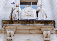 There is no surviving correspondence in the King's College London Archives and at the College of Arms regarding the choice of the original coat of arms. A wide variety of unofficial adaptations have been used during the college history.[5] The original arms can still be seen at the entrance to the 19th century King's Building at the Strand Campus.