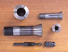 A collet /ˈkɒlᵻt/ is a subtype of chuck that forms a collar around an object to be held and exerts a strong clamping force on the object when it is tightened, usually by means of a tapered outer collar. It may be used to hold a workpiece or a tool.