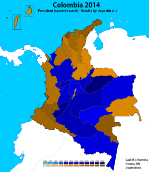 Presidential elections were held in Colombia on May 25, 2014.[1] Since no candidate received 50% of the vote in the first round, a run-off between the two candidates with the most votes took place three weeks later on June 15, 2014.[2] According to the official figures released by the National Registry office (Registraduría Nacional), as of May 22, 2014 (the cut-off date to register) 32,975,158 Colombians were registered and entitled to vote in the 2014 presidential election, including 545,976 Colombians resident abroad.[3][4] Incumbent president Juan Manuel Santos was allowed to run for a second consecutive term.[5] In the first round, Santos and Óscar Iván Zuluaga of the Democratic Center (Centro Democrático) were the two highest-polling candidates and were the contestants in the June 15 run-off.[6][7] In the second round, Santos was re-elected president, gaining 50.95% of the vote compared with 45.00% for Zuluaga.[8]