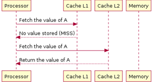 When the data is not where the processor is looking for, it is called a cache-miss. Below, pictures show how the processor fetch data when there are two cache levels.