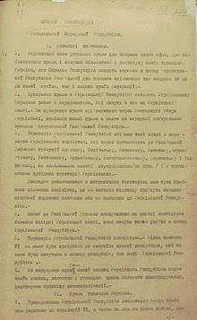 The Constitution of Ukrainian National Republic (Ukrainian: Конституція Української Народної Республіки, Konstytutsiya Ukrayinskoi Narodnoi Respubliky) is a constitutional document approved by the Central Rada on April 29, 1918, but never promulgated. Hence the document never acquired the legal power. Nevertheless, it remains an important document from the period of the Ukrainian National Republic from 1917-1918.