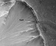 South rim of Coprates Chasma, image is about a kilometer wide. With enhanced IR colors, we see a portion of the very top of the south wall of the canyon, looking down onto the steep upper slopes of the canyon.- Faults, as seen by HiRISE. Layers in the rock face may be from volcanic, lacustrine, and/or aeolian sediments deposited in Valles Marineris.