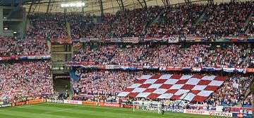 Most home matches are played at the Maksimir Stadium in Zagreb, with some fixtures also taking place at the Poljud Stadium in Split or at other, smaller venues, such as Kantrida Stadium in Rijeka or Gradski Vrt in Osijek. The team was undefeated in its first 36 home competitive matches at Maksimir, the run ending with a heavy defeat to England in September 2008.[3][6][7][8] The team's traditional nickname is Vatreni ("The Blazers").[9]