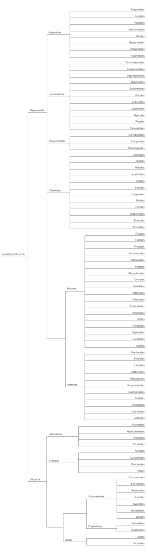 The Cronquist system is a taxonomic classification system of flowering plants. It was developed by Arthur Cronquist in his texts An Integrated System of Classification of Flowering Plants (1981) and The Evolution and Classification of Flowering Plants (1968; 2nd edition, 1988). Cronquist's system places flowering plants into two broad classes, Magnoliopsida (dicotyledons) and Liliopsida (monocotyledons). Within these classes, related orders are grouped into subclasses. While the scheme was widely used, in either the original form or in adapted versions, many botanists now use the Angiosperm Phylogeny Group classification for the orders and families of flowering plants, first developed in 1998. The system as laid out in Cronquist's An Integrated System of Classification of Flowering Plants (1981) counts 64 orders and 321 families in class Magnoliopsida and 19 orders and 65 families in class Liliopsida.