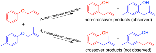 The mechanism of the thermal Claisen rearrangement has been studied by crossover experiment and serves as an excellent example of how to apply this technique.[9] Before the mechanism was determined, it was proposed that the reaction could proceed via an intermolecular or intramolecular route.[1]