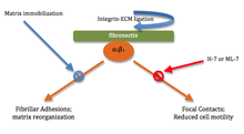 Crosstalk can even be observed across membranes. Membrane interactions with the extracellular matrix (ECM) and with neighboring cells can trigger a variety of responses within the cell. However, the topography and mechanical properties of the ECM also come to play an important role in powerful, complex crosstalk with the cells growing on or inside the matrix.[7] For example, integrin-mediated cytoskeleton assembly and even cell motility are affected by the physical state of the ECM.[7] Binding of the α5β1 integrin to its ligand (fibronectin) activates the formation of fibrillar adhesions and actin filaments.[5] Yet, if the ECM is immobilized, matrix reorganization of this kind and formation of fibrillar adhesions is inhibited.[7] In turn, binding of the same integrin (α5β1) to an immobilized fibronectin ligand is seen to form highly phosphorylated focal contacts/focal adhesion (cells involved in matrix adhesion) within the membrane and reduces cell migration rates[7] In another example of crosstalk, this change in the composition of focal contacts in the cytoskeleton can be inhibited by members of yet another pathway: inhibitors of myosin light-chain kinases or Rho kinases, H-7 or ML-7, which reduce cell contractility and consequently motility.[7] (see figure 2).