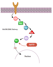 Phosphorylation of this third site by PKAs from the cAMP pathway inhibits binding of MAP kinases to HePTP and thereby upregulates the MAPK/ERK signaling cascade. The MAPK pathway, through Ras, Raf, Mek, and Erk, shows low activity in the presence of unphosphorylated (active) HePTP. However, activation the cAMP pathway stimulates the activation of PKA, which in turn phosphorylates HePTP at Ser23. This prevents HePTP from binding to Erk and frees the MAPK pathway from inhibition, allowing downstream signaling to continue (see figure 4).