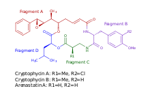 - ↑ Panda, D; Himes, RH; Moore, RE; Wilson, L; Jordan, MA (21 October 1997). "Mechanism of action of the unusually potent microtubule inhibitor cryptophycin 1.". Biochemistry. 36 (42): 12948–53. doi:10.1021/bi971302p. PMID 9335554.