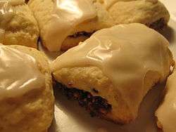 Cuccidati is a Sicilian fig-stuffed cookie traditionally served at Christmas time.[1][2] When Italians first made them they used in the cookie what was cheapest and thus why figs are used.