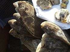 Fried sweet foods include cubed and spiced ripe plantain (kelewele) sometimes served with peanuts. Koose made from peeled beans (and its close twin Acarajé or akara made from beans which is not peeled), maasa,[7][8] pinkaaso,[9] and ballfloat/puff-puff[10] (made from wheat flour); kuli-kuli,[11] dzowey and nkate cake (made from peanuts);[12] kaklo and tatale[13] (ripe plantain fritters); kube cake and kube toffee (made from coconut); bankye krakro, gari biscuit,[14][15] and krakye ayuosu (made from cassava); condensed milk, toffee, plantain chips (or fried plantain)[16] and wagashi[17] (fried farmer's cheese) are fried Ghanaian savory foods (confectionery).