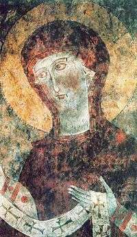 The fresco on the southern wall shows the Holy Virgin in a long robe with a red kerchief tied around her head. She is holding an oration adorned with crosses. Another fresco portrays the Christ, as he is giving the Gospel to St. Nicholas. The fresco on the northern wall represents the birth of Jesus: St. Joseph stands at St. Mary's bedside, and the three magicians kneel in adoration in front; cherubs fly in the sky above them, singing Glory in Highest Heaven.[84] A native of Artsakh and the 13th century author Kirakos Gandzaketsi (Armenian: Կիրակոս Գանձակեցի) hints in his "History of Armenia" that Queen Arzou (Armenian: Առզու Թագուհի) and her daughters were gifted with exceptional artistic talent, so it has been theorized that they could have been among those who helped paint the murals.[85] Other than at Dadivank, Some other frescoes are found in the main parish church of the town of Arajadzor in Mardakert District.