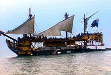 The filmmakers chose St. Vincent as their primary shooting location, as it contained the quietest beach they could find, and built three piers and a backlot for Port Royal and Tortuga.[18] Of most importance to the film were the three ships: the Black Pearl, the Dauntless, and the Interceptor. For budget reasons, the ships were built on docks, with only six days spent in the open sea for the battle between the Black Pearl and the Interceptor.[22] The Dauntless and the Black Pearl were built on barges, with computer-generated imagery finishing the structures. The Black Pearl was also built on the Spruce Goose stage, in order to control fog and lighting.[18] The Interceptor was a re-dressed Lady Washington, a full-scale replica sailing ship from Aberdeen, Washington, fully repainted before going on a 40-day voyage beginning December 2, 2002, arriving on location on January 12, 2003.[23] A miniature was also built for the storm sequence.[18]