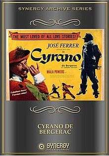 Cyrano de Bergerac is a 1950 drama romance film based on the 1897 French Alexandrine verse drama Cyrano de Bergerac by Edmond Rostand. It uses poet Brian Hooker's 1923 English blank verse translation as the basis for its screenplay.[3] The film was the first motion picture version in English of Rostand's play, though there were several earlier adaptations in different languages.