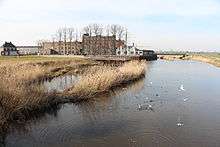 The ensemble of the DRU Cultuurfabriek at the river Oude IJssel, seen from the south. In the background, to the left: the SSP-hal, in the center the Portiersgebouw (the actual 'culture factory' and further to the right in white the library.