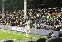Murphy prepares to take a corner against one of his former clubs, Liverpool