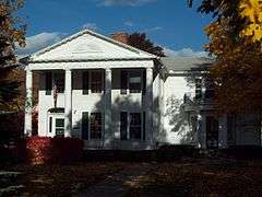Dansville Library is a historic library located at Dansville in Livingston County, New York. It is a large two story Neoclassical style frame structure. It is dramatically enhanced by a pedimented, giant portico covering its full width. The portico features four Doric columns, an elaborate frieze with triglyphs and rosettes, a modillion cornice, and a semi-ellipical fan decoration in the cornice. The earliest section was built in 1823 as a private home for Joshua Shepard (1780–1829). The Shepard family donated the house for use as a library in 1923.[2]