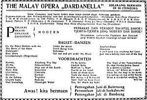 Their plays were presented in Malay and often adapted works by other writers.[3] Some works, such as those by Victor Ido, were translated from the original when adapted for stage.[3] Dardanella and its contemporary rival Miss Riboet's Orion – established a year before – were some of the first travelling troupes in the Indies to use original works; earlier bangsawan and stambul troupes had used broad outlines of foreign works.[15][10] The two were the most popular troupes from the Indies of their time.[10]