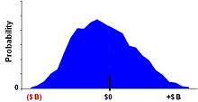 Using simulation, for each sample, the engine draws a random variable from both ST and XT, calculates their present values, and takes the difference.[4][5] Fig. 2A. The difference value is compared to zero, the maximum of the two is determined, and the resulting value recorded by the simulation engine. Here, reflecting the optionality inherent in the project, a forecast of a net negative value outcome corresponds to an abandoned project, and has a zero value. Fig. 2B. The resulting values create a payoff distribution representing the economically rational set of plausible, discounted value forecasts of the project at time t0.