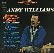 Days of Wine and Roses and Other TV Requests is an album by American pop singer Andy Williams that was released in April 1963 by Columbia Records.[3] It made its first appearance on Billboard magazine's Top LP's chart in the issue dated April 20 of that year and remained on the album chart for 107 weeks, spending 16 consecutive weeks at number one.[4] The album received Gold certification from the Recording Industry Association of America on September 19, 1963, becoming his first to do so, while his 1962 album Moon River and Other Great Movie Themes followed suit one month later.[5] For its release in the UK, the album was retitled Can't Get Used to Losing You and Other Requests, and it spent its only week on the album chart there at number 16 in 1965.[6][7]