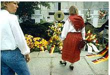 In 1991 Berlin's public prosecution department rendered this incident assistance in emergency and self-defence in consequence of the police officer stating that he felt his life being threatened.[27] In many cases West Berliner rescuers were not able to reach wounded persons because they were either on GDR territory or in East Berlin. They had no authorization to set foot into this territory, so that a trespassing would have been life-endangering for the rescue workers. The four children Çetin Mert, Cengaver Katrancı, Siegfried Kroboth and Giuseppe Savoca, who fell into the Spree at the Gröben riverside between the years 1972 and 1975, could not be rescued even though West Berlin rescue forces arrived quickly on site.[35] In April 1983 the transit passenger Rudolf Burkert died of a heart attack during an interrogation at the border checkpoint Derwitz. During a subsequent autopsy in West Germany several external injuries were detected, so that an external forceful impact could not be ruled out as the cause of death. This lethal incident resulted not only in negative press reports but also led to an intervention by Helmut Kohl and Franz Josef Strauss. For the imminent public-sector loans they imposed on the GDR the condition to conduct humane border controls. Two further deaths of West Germans in transit traffic, shortly after Burkert's death, set off demonstrations against the GDR regime and a broad media discussion.[36] In the period that followed inspections decreased in transit traffic.