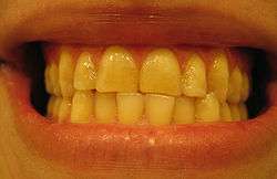 A profile of a smile, exhibiting a deviated dental midline about 2 mm to the left (the midline is measured as the mandible in relation to the maxilla. Even though the teeth are in an edge-to-edge position, the teeth are in maximum intercuspation; this patient possesses a Class III occlusion.
