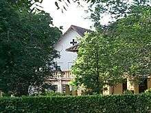 The history of Bishop Heber Hall could be traced back to a similar school started by a German missionary Christian Frederick Schwartz at Trichy in 1762.[19] The school at Trichy grew and became a college in 1878. It was named Bishop Heber College after Bishop Reginald Heber (1783–1826) the hymn writer and erstwhile Bishop of Calcutta. In 1934 this college was closed and merged with Madras Christian College.[20] The teachers and students who shifted to Madras formed the Bishop Heber Hostel at Vepery. After a short stay at Vepery and later at Royapettah, the hostel moved out with the rest of Madras Christian College to Tambaram in 1937.[21] The chapel, the hall library and the coat of arms are reminders of the transformation of the college at Trichy to the Bishop Heber Hall at Tambaram. Heber Hall, as it is known, has several features that are unique to it- a natural pond in its courtyard, the Bishop Heber Chapel and the bridge across the facade of this chapel.