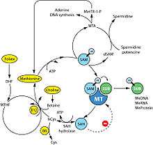 - ↑ Poirier, LA; Wise, CK; Delongchamp, RR; Sinha, R (June 2001). "Blood determinations of S-adenosylmethionine, S-adenosylhomocysteine, and homocysteine: Correlations with diet". Cancer Epidemiology, Biomarkers & Prevention. 10 (6): 649–55. PMID 11401915.
