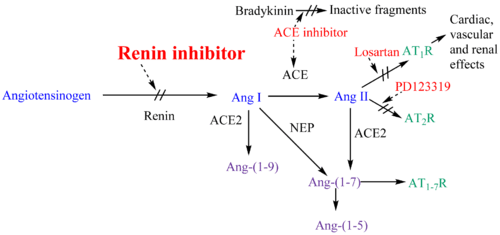 Renin inhibitors bind to the active site of renin and inhibit the binding of renin to angiotensinogen, which is the rate-determining step of the RAAS cascade.[16] Consequently, renin inhibitors prevent the formation of Ang I and Ang II. Renin inhibitors may also prevent Ang-(1-7), Ang-(1-9) and Ang-(1-5) formation,[20] although it is not known if this is clinically important. Renin is highly selective for its only naturally occurring substrate which is angiotensinogen, and the incidence of unwanted side effects with a renin inhibitor is infrequent.[21] and similar to angiotensin II receptor antagonists.[22] Ang II also functions within the RAAS as a negative feedback to suppress further release of renin. A reduction in Ang II levels or blockade of angiotensin receptors will suppress the feedback loop and lead to increased plasma renin concentrations (PRC) and plasma renin activity (PRA). This can be problematic for ACE inhibitor and angiotensin II receptor antagonist therapy since increased PRA could partially overcome the pharmacologic inhibition of the RAAS cascade. Because renin inhibitors directly affect renin activity, decrease of PRA despite the increased PRC (from loss of the negative feedback) may be clinically advantageous.[23]