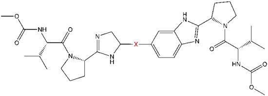 - 1 2 3 Lemm, J. A.; Leet, J. E.; O'Boyle, D. R.; Romine, J. L.; Huang, X. S.; Schroeder, D. R.; Alberts, J.; Cantone, J. L.; Sun, J.-H.; Nower, P. T.; Martin, S. W.; Serrano-Wu, M. H.; Meanwell, N. A.; Snyder, L. B.; Gao, M. (16 May 2011). "Discovery of Potent Hepatitis C Virus NS5A Inhibitors with Dimeric Structures". Antimicrobial Agents and Chemotherapy. 55 (8): 3795–3802. doi:10.1128/AAC.00146-11.