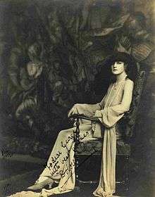 During the First World War, Duff Gordon's focus shifted to her New York office which she had opened in 1910.[11] For her New York fashion shows she imported her own models from England, although Dolores was not among the first she brought over. The shows became so popular that she had to start holding them in a theatre.[10] It was probably at one such event around 1916 that Florenz Ziegfeld and his wife Billie Burke discovered Duff Gordon's designs and her model Dolores.[10] Ziegfeld was enraptured by Dolores and the luxurious spectacle of the show and Burke ordered two of Duff Gordon's creations.[11] Soon, Duff Gordon was making costumes for Ziegfeld's theatrical productions, the Ziegfeld Follies.[12]