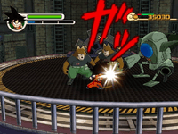 Players can battle with a basic or mêlée combat system. The two meters on the top left hand corner represent health and ki, while the on right represent zeni just collected.