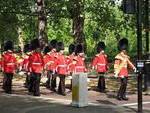 The insignia of appointment in the Royal Marines and British Army is four point-up chevrons worn on a wrist-strap whilst in shirt-sleeve order, or four large point-up chevrons worn on the uniform sleeve, surmounted by a drum. In the British Army, staff sergeants/colour sergeants have a small crown above the drum, whilst warrant officers class 2 have a larger crown. Since the drum major is part of the battalion staff, he wears a crimson sash instead of scarlet, and dresses as a warrant officer regardless of his rank. He is always referred to and addressed as "Drum Major" or "Sir" and not by his rank.