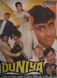 Duniya (Hindi: दुनिया; English: The World) is a 1968 Hindi romantic thriller film written by K. A. Narayan and directed by T. Prakash Rao. The film starred Dev Anand, Vyjayanthimala in the lead with Balraj Sahni, Johnny Walker, Lalita Pawar, Prem Chopra, Sulochana Latkar, Madan Puri, Nana Palsikar, Achala Sachdev, Laxmi Chhaya, Jagdish Raj, Tun Tun, Brahm Bhardwaj and Pakistani actor Suresh as the ensemble cast. The film was produced by Amarjeet.[1][2] The film's score was composed by Shankar Jaikishan duo with lyrics provided by Hasrat Jaipuri, S. H. Bihari and Gopaldas Neeraj, edited by Shivaji Awdhut and was filmed by Faredoon A. Irani. The story revolves around three friends Amarnath, Gopal and his sister, Mala, how they face their problem in the life and how they realize from the problem in the rest of the story.