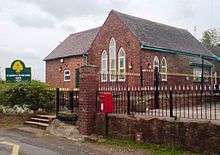 It is now called Dunston Church of England Voluntary Primary Controlled School, Junior Mixed and Infants. The building is of red brick, the original block, dating from 1866, has lancet windows with diagonal glazing bars.[13]